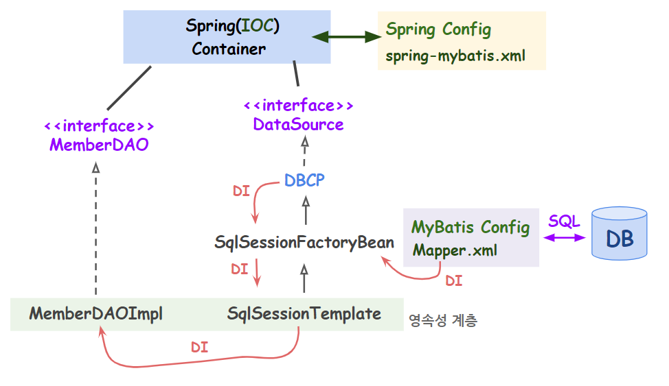 나머지 일은 SqlSessionFactoryBean, Mapper.xml 정보를 DI로 주입받아 사용한다. - MemberDAOImpl : template을 주입받아 사용한다. (return template.selectOne(""))