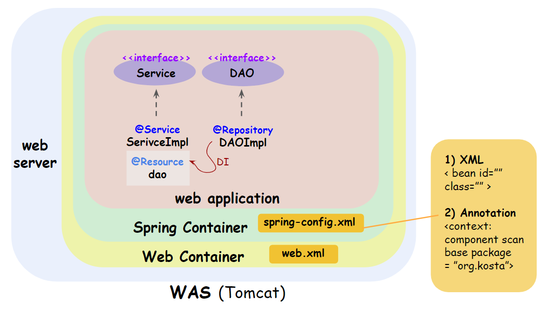 - 위 세가지 경우에 해당하지 않는 기타 자원 클래스에 사용 (ex. IOC/DI다 되지만 세밀한 제어X) - @DI(Dependency Injection) 계열 어노테이션 : 스프링 컨테이너로부터 의존성(의존대상객체)를 주입받고자 할 때 사용